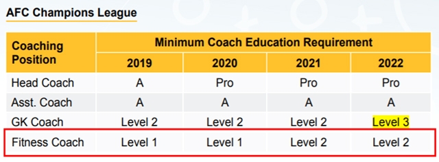 AFC主催大会に出場するチームのフィットネスコーチの持つべき最低資格は以下のように設定されており、これに対応するためJFAでは3回目となるレベル1コースを開催いたします。