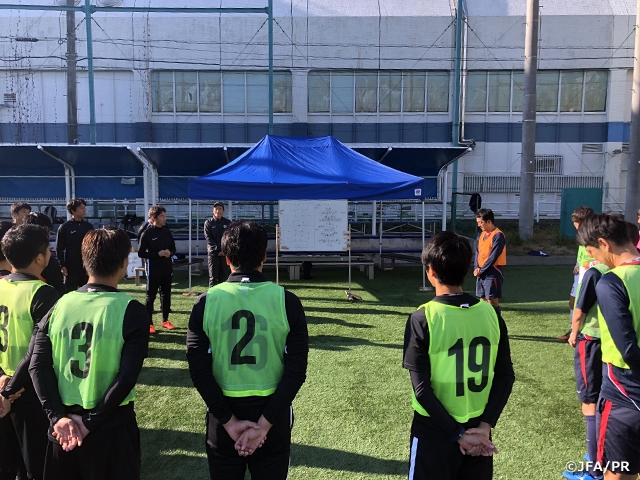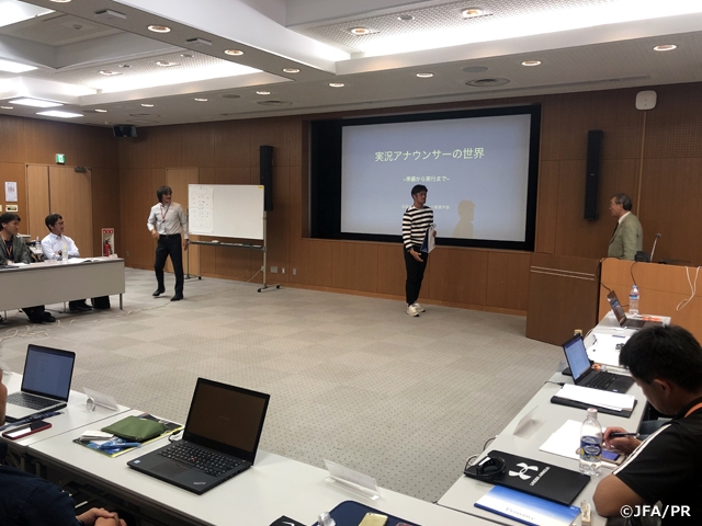 指導実践では再び7つのテーマに戻り、三菱養和スタッフと江戸川大学サッカー部の協力を得て、実践が行われました。Module4の「サッカーをさせる」「プレーさせる」というテーマの中、監督としての意図や狙い、スパーリングチームへの働きかけ、その変化に対する対応などがより高いレベルで求められ、どのセッションもディスカッションを含めて内容の濃いものになりました。