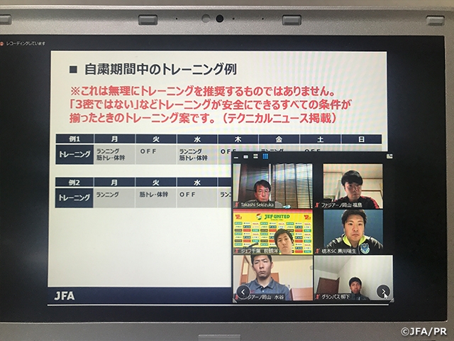 まず、JFAからは、トレーニングをしないことによる体力や運動能力の低下や活動再開後のトレーニング強度の設定の仕方等について科学的な見解を交えた説明と、トレーニングの実施例について報告をしました。その後、各クラブからの現状の報告や自主トレに関する活動事例を紹介いただき、質疑応答を行い終了しました。