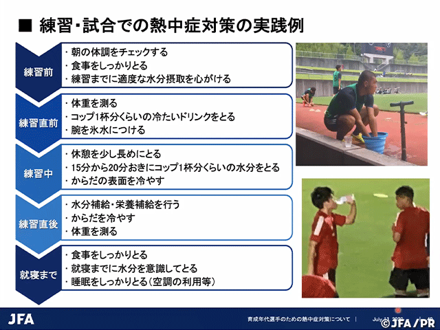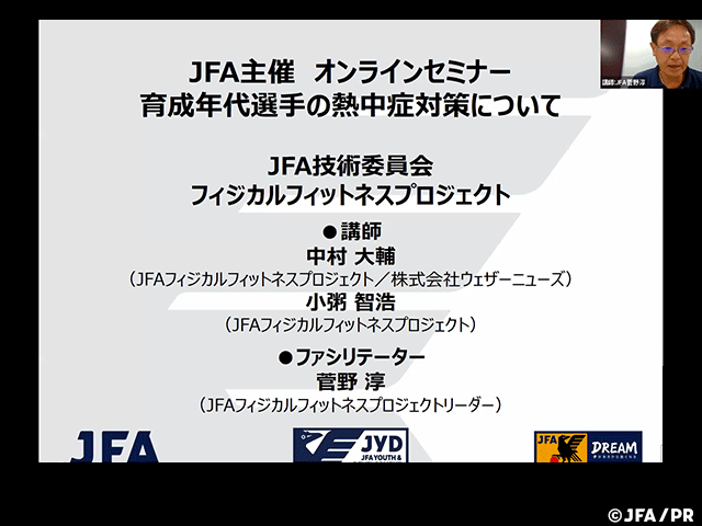 JFAフィジカルフィトネスプロジェクトでは7月13日(月)、「育成年代選手のための熱中症対策」というテーマで熱中症対策の情報提供を目的としたオンラインセミナーを実施し、チーム関係者等約200人が参加しました。