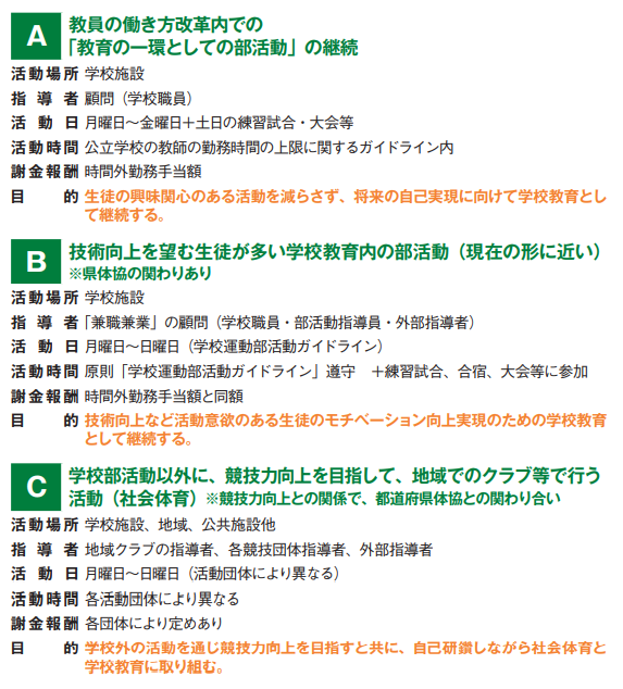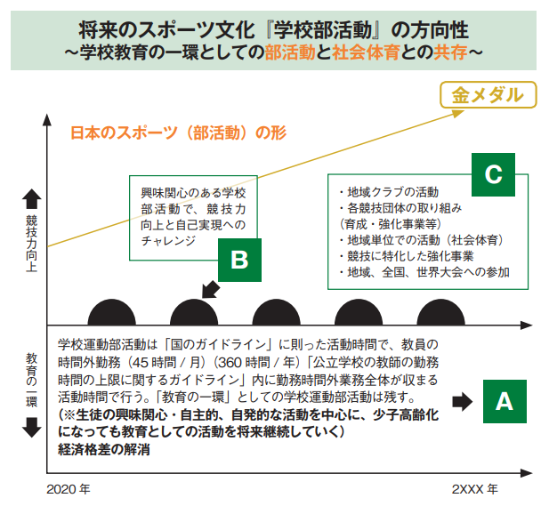 AとCは現状でも問題なく続いていくでしょう。ただ、Bをどう考えるか。もちろんBは全ての学校がそうである必要はありません。それぞれの学校の特色に合わせて都道府県にいくつかあればいいのではないかということで、このBの形を残しながら、この三つが絡み合った形が日本の将来の部活動の形になることが望ましいと考えています。