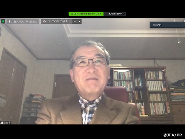 まずは、新型コロナウイルス禍の中、2020年S級ライセンス講習会を開催するにあたり、御尽力いただいた方々に心から感謝しております。Module2オンライン3週目は、W杯メキシコ大会での「マラドーナ」の実況でおなじみの元アナウンサー山本浩さんによる『メディア論』から始まりました。自己紹介や会見、インタビュー時の、心構えや注意点、コツなど、参考例を交えながら非常に分かりやすく学びました。