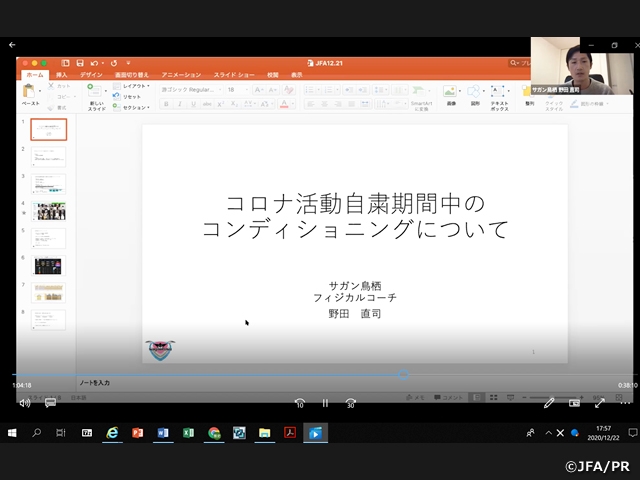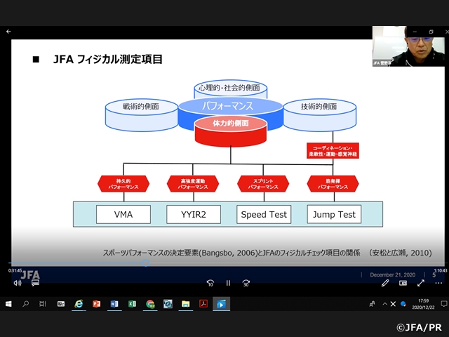 日本サッカー協会(JFA)は、フィジカルフィットネスプロジェクト主催事業として、J1~J3クラブのフィジカルコンディショニングスタッフ研修会を、12月21日にオンラインで開催しました。今回の研修会は、新型コロナウイルス感染症の影響による活動自粛後のコンディショニングについて情報共有をし、各クラブのトレーニング計画の参考としていただくことを目的に実施しました。