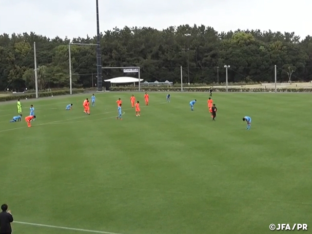 プレマッチデーファンクションでは、監督、コーチ、GKコーチ、フィジカルコーチ、テクニカルスタッフと役割を決め、江戸川大学のプレーヤーに実践をしました。プレーヤーは、午前中に指導実践を行っており、疲れていたと思います。ところが、試合前ミーティングから、個々の役割やチームのコンセプト、何よりも勝たなければならないゲームが目の前にあるということを伝えられ、大きく目を輝かせて、代表ピッチであるAピッチに飛び出していきました。試合中には、インカムを通してテクニカルスタッフとベンチとのやり取りがなされていました。また、ハーフタイムに、スタッフでプレーヤーに見せるビデオの選択や順番、ミーティング内容の確認をしている姿は真剣そのものでした。タイムアップの笛が鳴った時、敗戦チームは悔しさを表現し、勝者は喜びを爆発させました。そこには、全力を尽くして最後まで戦ったチームの姿がありました。