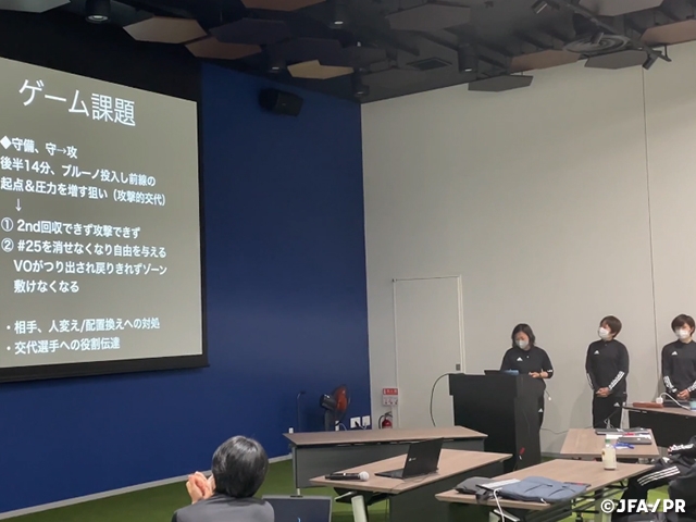 また、その日の夜は、J1リーグ戦・川崎フロンターレ対アビスパ福岡戦の試合視察をしました。各グループで立場を変えて試合を分析し、翌4日目は、グループ毎にゲーム分析のプレゼンテーションを行いました。