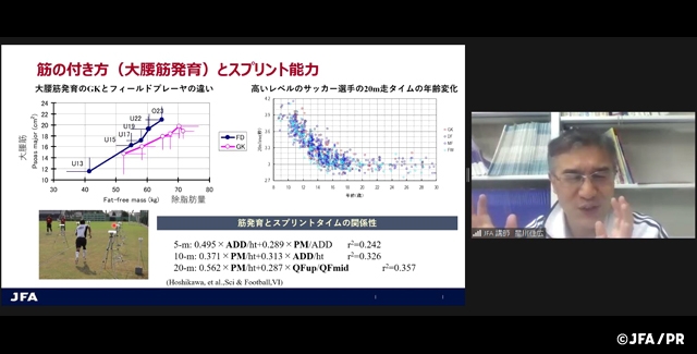 フィジカルフィットネスプロジェクトメンバーの星川佳広氏を講師に迎え、「育成期選手のからだづくりと体力づくり」をテーマに講義およびグループディスカッションを行いました。今回の研修会には、指導者41名が参加。受講者は講義を通じて、育成期選手のからだづくりと体力づくりについて科学的データを基に体系的に学びました。また、それぞれの現場における、からだの小さい選手(あるいは成長の遅い選手)の指導上の工夫や事例、選手のからだづくりに関する実践例をグループディスカッションにて情報共有し、理解を深めました。