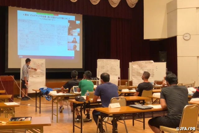 前期コースは2020年1月に実施しましたが、2020年6月に予定していた後期コースが中止となり、今回は1年ぶりに後期コースを開催することになりました。実技では事前にトレーニングの指導案を作成し、大学生プレーヤーに来ていただいてゲーム形式で指導の実践を行いました。講義ではテーマを決めて受講生同士でディスカッションを行い、発表しました。後期コースに参加できない受講生とは会場とオンラインで接続し、ディスカッションで活発な議論を交わしました。新型コロナウイルス感染拡大防止のため、プレーをする時以外は常時マスクを着用し、食事会場や講義会場、グラウンドでの手指消毒、ディスタンスの確保、備品の消毒、黙食などを徹底し、感染対策を万全にして実施しました。