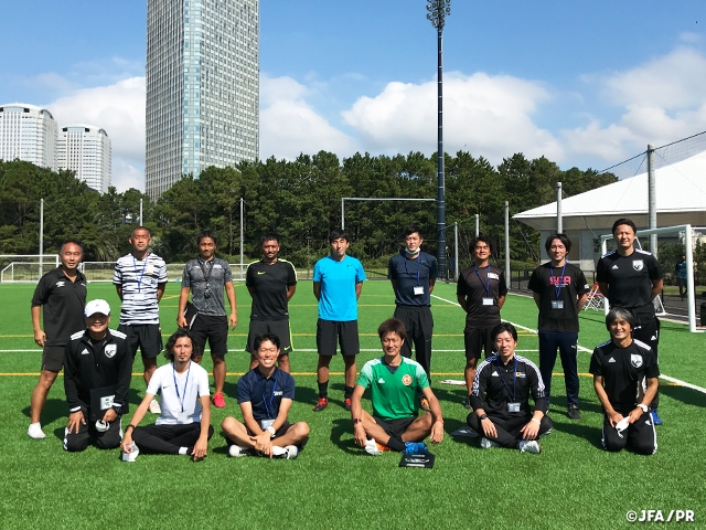 今回のコースでは、1コース12名の受講生に対しインストラクター3名体制で指導実践とディスカッションを繰り返し実施しました。受講生は3人ずつのグループに分かれて指導実践のプランニングとディスカッションを重ね、監督・コーチ・GKコーチとして1回ずつ、計3回指導実践を行いました。「指導に正解はない」というキーワードからスタートしたスキルアップコースは、学びたい意欲に満ち溢れた参加者とその意欲を受け止め、参加者と一緒になって考え、課題に向かい合うインストラクター双方にとって実り多い研修となりました。