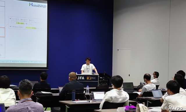 東京電機大学の福富慎也さんからは、リーダーシップとフォロワーシップによるチームビルディング手法を学びました。「監督のみが決断を行うリーダーシップは、条件によっては有効なマネジメント手法になる。ただし、リーダーである監督の限界が組織の限界になりやすい」と話されました。一方で、「コーチも決断に関わるフォロワーシップでは、リーダーの発想を上回る意見が出てくる。チームとしての力も発揮されやすい」との説明があり、絶対解が存在しないサッカーや予測困難な時代に立ち向かえるマネジメントであることを学びました。