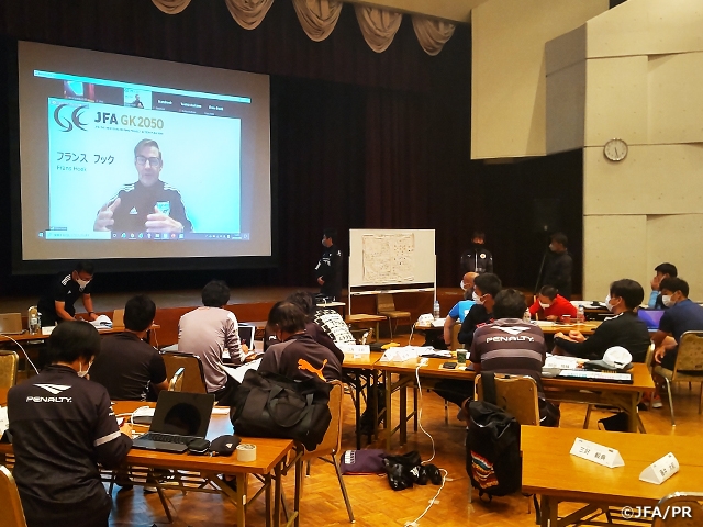 JFA GKプロジェクトアドバイザーでGK界のレジェンドであるフランス・フック氏の来日は叶いませんでしたが、フック氏はオンラインで参加し、講義と指導実践に対する受講生にフィードバックをしました。