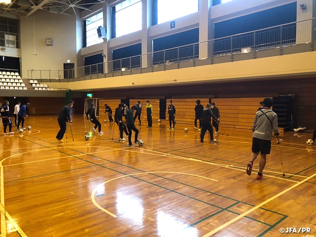 障がい者サッカーに携わる方とB・C級のリフレッシュ研修として実施しました。アイマスクやアンプティサッカー用のクラッチを使い、しっぽとりやボール回しを体験し、ともに学ぶ貴重な機会となりました。