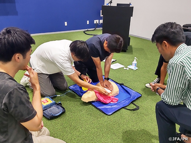 救命救急の講義では、サッカー現場で起きた事例を元にどのように命を守るか等の知識を学ぶ場になりました。心停止が起きた際、放置しておけば1分ごとに生存率が7~10%落ちると言われており、そうならないためにもAED機器の使い方や胸骨圧迫、救急車を迅速に呼ぶことなど実技を交えて講習しました。指導現場に立つ時、このような事例と常に隣り合わせであるという認識を持ち、いかなる時でも冷静に且つ迅速に対応できる心の準備を日頃からしておかなければならないことを学ぶ時間になりました。