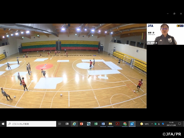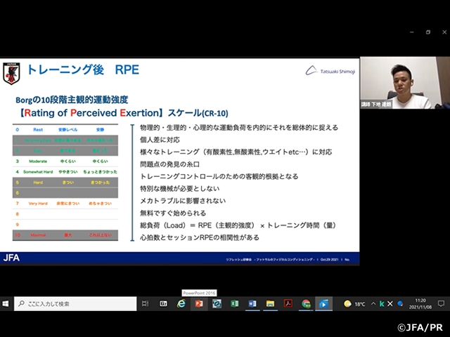 フィジカルフィットネスプロジェクトメンバーでフットサル日本代表フィジカルコーチの下地達朗氏(※10月末日で退任)を講師に迎え、「フットサルのフィジカルコンディショニング」というテーマで講義を行いました。FIFA フットサルワールドカップ リトアニア2021に出場したフットサル日本代表の合宿から本番までの約10週間のトレーニングメニュー、運動強度や心拍数のデータ等について動画、グラフを交えながら説明がありました。