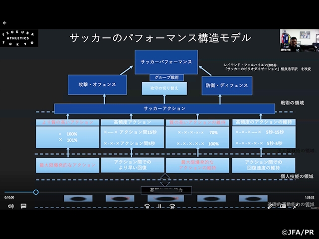 今回はフィジカルフィットネスプロジェクトメンバーで筑波大学准教授の谷川聡氏を講師に迎え、「サッカー選手のためのスプリントトレーニング」というテーマで講義を行いました。JFAアカデミーのトレーニングメニューや日本代表選手のスプリントトレーニングなどについて、動画やデータを交えながら説明し、受講者はサッカー選手のためのスプリントトレーニングの理論・方法などを学びました。