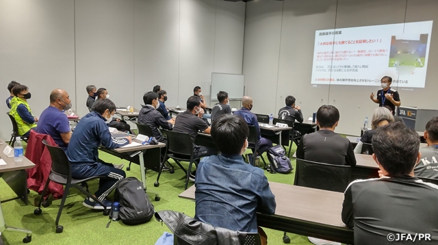 講義では、育成年代で行うべき筋力トレーニングに関する基礎知識を学び、日常のトレーニングに活かせる映像などを視聴しました。またペアワークなどを通し活発な意見交換や質疑応答が行われました。