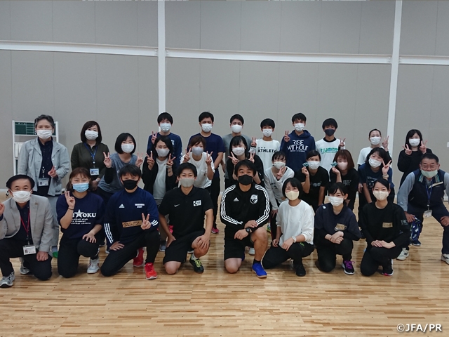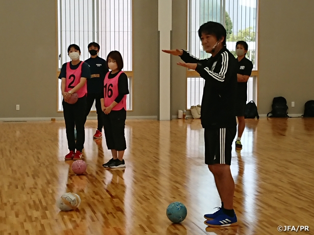 徳島県の小学校教員及び教員を志望する大学生を対象に、JFAが考える、体育の楽しいサッカーの授業について研修会を実施しました。本研修会の目的の1つである、「まずは、参加者の皆様がやって楽しいと思える」活動になるよう、コロナ禍でも実施可能なものを提供することを考えました。