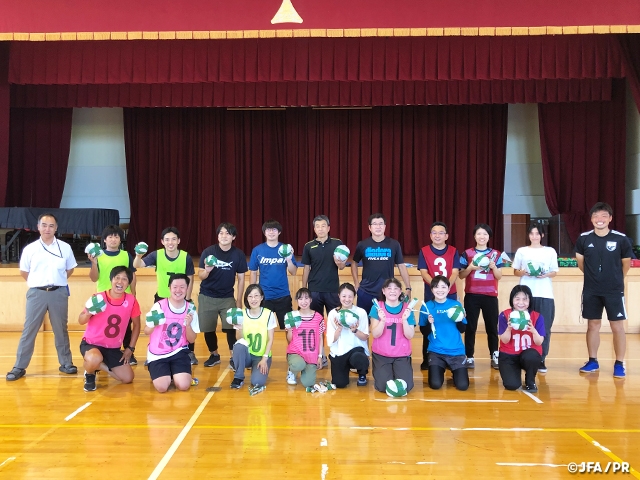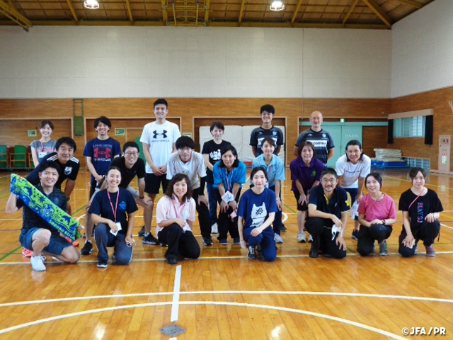 この研修を楽しみにしていました。最初の準備運動の段階から他の人と触れ合い、チームとしての競技であることの意識を持つことができ、さらには抵抗感のないステップで進んでいきました。研修を受けている私たちに対するフォローのある声かけや態度にとても安心感をもって参加できました。また、サッカーに限らず、1人では行うことができなくても、他の人との連携することの大切さを十分に感じることができました。