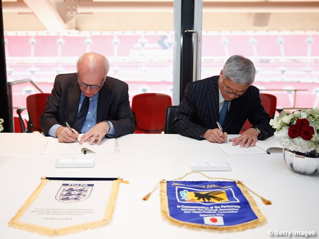 Japan Football Association (JFA) has signed a MoU with The Football Association (The FA) on 24 February at Wembley Stadium. This first agreement in between the football governing bodies will strengthen the mutual relationship and lead them to cooperate together for a further development of football in both England and Japan.