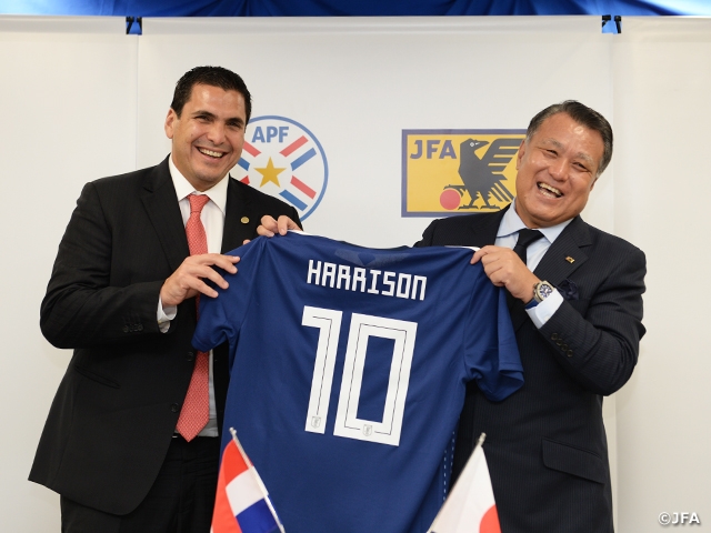 The signing ceremony took place at Kashima Stadium, the venue for KIRIN CHALLENGE CUP 2019, and the ceremony went in an amicable manner with the presence of Mr. Robert HARRISON, President of Paraguayan Football Association and Mr. TASHIMA Kohzo, President of Japan Football Association.