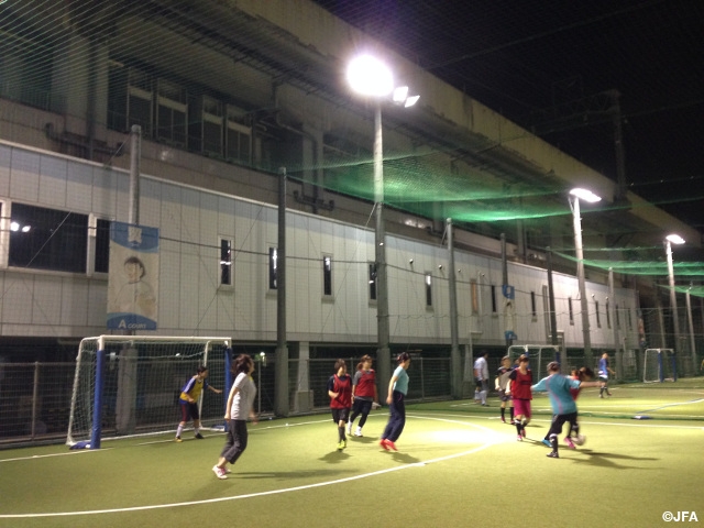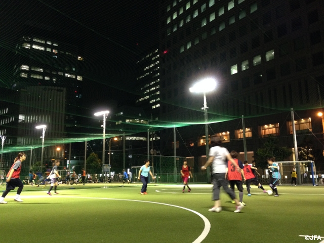Captain Tsubasa Stadium Shin-Osaka held JFA Nadeshiko Friends Square on Wednesday, 9 July. Women players, many of them were beginners, joined the event in spite of drizzle, enjoying various programs such as a Shippo-tori game, or tag game, that they could have fun to learn and a actual futsal game in 5-on-5 style at the end.