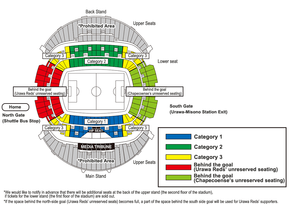 - If the space behind the north-side goal (Urawa Reds’ unreserved seats) becomes full, a part of the space behind the south side goal will be used for Urawa Reds’ supporters.