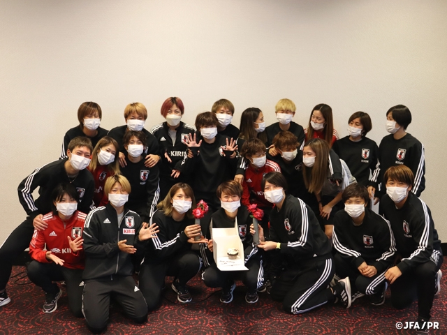 As the team prepares for their match against the Netherlands, the team celebrated the 22nd birthday of MIYAZAWA Hinata (Mynavi Sendai Ladies) on this day. In measures to prevent the spread of Covid-19, they were not able to share the birthday cake, but a sense of unity was born by celebrating their teammate’s birthday. Through the intense training session on the pitch and the relaxed atmosphere off the pitch, the team is now ready to enter the match against the Netherlands, which will be a crucial test match for the new Nadeshiko Japan.