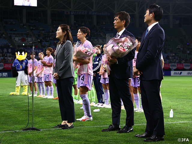 After the match, a send-off ceremony was held, in which Ms. SAWA Homare, former Nadeshiko Japan player, and Mr. MORIYASU Hajime, Head Coach of the SAMURAI BLUE (Japan National Team), appeared as guests. At the ceremony, Sawa encouraged the players to “go out there and enjoy the game you love,” while coach Moriyasu called out to the stands, “Let's all support this magnificent squad chosen by Coach Ikeda.” Team captain Kumagai was applauded by the crowd of 10,206, when she concluded the ceremony by saying, “We will do our best to compete against the world and become a inspiration to all girls who play football. Please give us your support.”