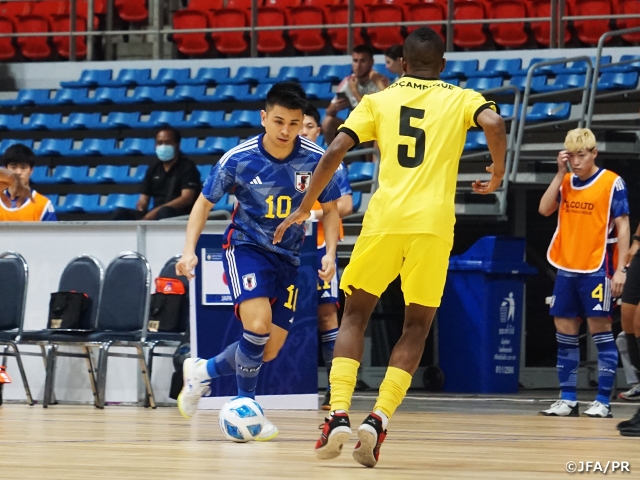 With a one goal lead, coach Kogure gave a pep-talk during halftime, “We've created a lot of chances so far and we're having a good game, so let's play with confidence. However, let's aim to score by playing more effectively and making conscious efforts to draw out our oppositions.” In contrast to the somewhat slow-paced first period, the second period featured plenty of action from the early minutes. Japan doubled their lead in the 21st minute, when the kick-in delivered by ISHIDA Kentaro induced an own goal. In the 35th minute, a shot taken by Oliveira once struck the post, but a team-mate collected the deflection to give the captain another shot at goal, which he managed to convert to make it 3-0. KANAZAWA Sora and Mori forced a turnover deep in the opposing end, which allowed Mori to send the ball into the net in the 37th minute, but this play was overturned after being reviewed by the Video support (VS) system, which was introduced for the first time in this tournament. Japan persisted in scoring goals because they required at least a four-goal advantage to claim the group lead after witnessing their group-rival Thailand thrash Mozambique 6-2 the day before. Their aggression was paid off in the 38th minute, when Harada carried the ball upfront before delivering a sharp pass to Mori, who superbly redirected the ball to extend the Japanese lead. After Mori completed his hat-trick in the 39th minute, Japan started off the tournament with a 5-0 victory.