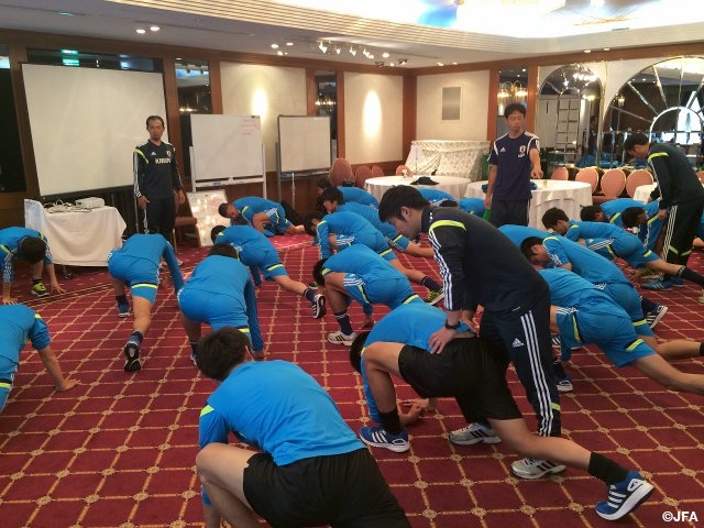 U-18 Japan’s national team had training in the morning and afternoon on the second day of their training camp. In the morning, at hotel before leaving for their training site, the squad worked on stretching and body balance exercises under Conditioning Coach OGAI Tomohiro’s instruction. And then, they moved to their practice field and went through training with the ball such as a 6v6 with goalkeepers and an 8v7 with goalkeepers. While the offensive side focused on improving the proper distance, which illustrates positioning of those with the ball and those without it, the defensive side tried to improve positioning for when they are outnumbered.