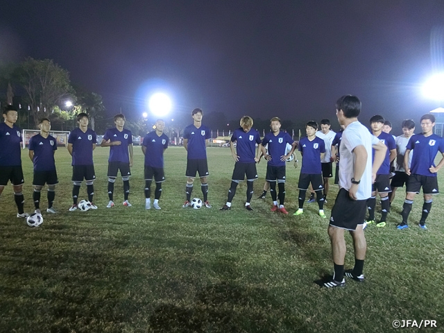 Then, later in the evening, midfielder KAMIYA Yuta (Ehime FC), who played 90 minutes in a J2 League match on Sunday 12, and OMINAMI Takuma (Jubilo Iwata), who was just called up Sunday night, joined the team. The full 20-man squad will take on Nepal, Pakistan and Vietnam in Group D and play up to seven matches in 19 days including the knockout stage starting with Round 16. Although the selection is limited with the “one-team, one-player” rule because the tournament takes place in the midst of the J.League season, the tournament is one of the few official tournaments before the 2020 Tokyo Olympics and an important opportunity to beef up the team. The young Japanese will be challenged to win the championship, which the London Olympics team achieved in the tournaments ago.