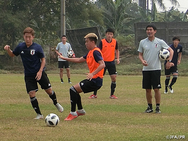 Given four days following their third group stage match against Vietnam, the team conducted a light session on the 20th to recover their conditions ahead of their next match against Malaysia. The following day on the 21st featured a session where the team played 9 vs 9 with a free player. The team was then separated by their positions where the defence line walked through their line-control, while the offence went over their combination plays and timing to attack. The session that took place on the 22nd saw the team conducting a 5 vs 5 possession drill, followed by a 10 vs 10 scrimmage utilising the full length of the pitch. Coach MORIYASU Hajime was heard giving out detailed instructions while the team worked on to deepen their combinations on the pitch.