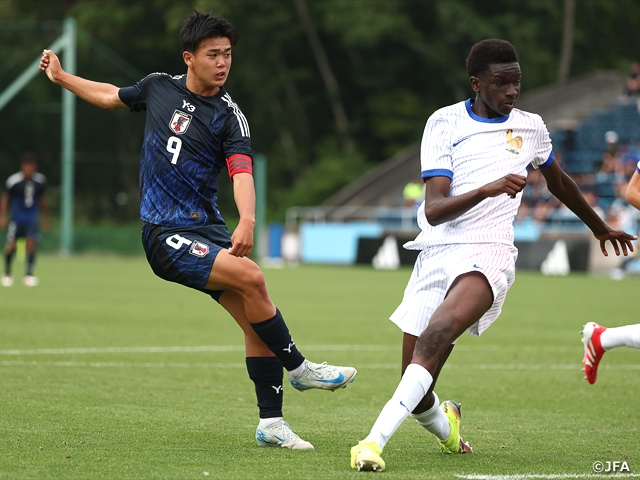 Responding to their coach’s words, the Japanese side adopted a high defensive line, applying pressure from the front to disrupt France’s build-up play. In attack, they frequently utilised TAKAKI Eito (Kashima Antlers Youth) as a target man to launch effective attacks.