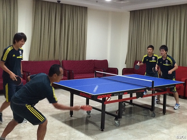 In this report we would like to cover some of their life off the pitch. There is a recreational lounge in their hotel where table tennis tables and billiard tables are available. Players take advantage of these amusements when they are free including time after lunch. Playing these games is actually helping players to increase the amount of their communication especially in a different way from what they share on the pitch. The photo shows a doubles match where Mochizuki and Tamura played against Coach Uchiyama and Technical Staff Katagiri, which turned out to be quite a close and heated match.