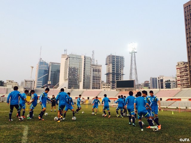 In the afternoon, the team had an official press conference at the Bangladesh Football Federation. The team’s Head Coach TEGURAMORI Makoto and a U-21 player MATSUBARA Ken attended the conference. “Even though Bangladeshi National Team is the National A team and has a lot of experience, we want to show 100% of our ability and to get good experience through the match”, commented MATSUBARA with confidence. In the evening, the team had an official training session for 60 minutes at Bangabandhu National Stadium, the venue of the match on the following day. While the pitch condition wasn’t good, the U-21 players had some practical strategy checking session as preparation for the match next day. The match against Bangladesh is the final match of this training camp