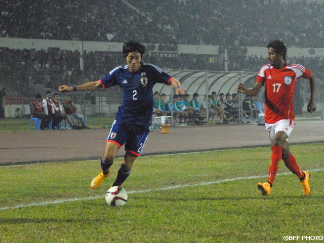 During the half time, Japan’s head coach Teguramori Makoto said to his players “We are controlling this match, so we should keep our poise and keep playing well. We will finish the year 2014 with a win.” In the second half, Japan started exhibiting furious attacks. In the 59th minute, forward Asano Takuma, who was just subbed in moments before, let a pass from midfielder Toyokawa Yuta into the goal to open the score. Japan finally broke down Bangladeshi defence by sticking to their offensive keys of “combination” and “third man’s spurt”.