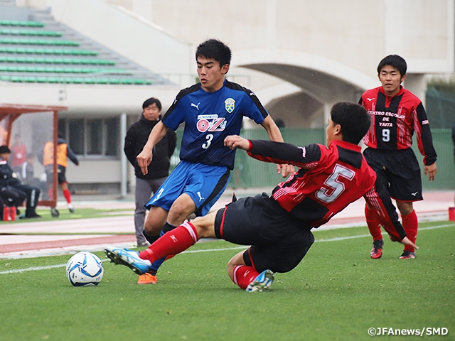 In the first match held at Coca-Cola Bottlers Japan Hiroshima Stadium, Yaita Chuo High School, the champions of the Kanto Prince League, played against Ozu High School, who aimed to return to the Premier League after getting relegated a year ago. Although the match saw Yaita Chuo initiating powerful attacks from their long balls, Ozu did well to evade their attacks as their defender FUKUSHIMA Hayato (#6) later commented, “Our opponents dropped back deeper than we expected, so we managed to keep possession of the ball.” Through their composed defence and ball movements, the Ozu side picked up their momentum. In the 43rd minute, they broke through the right flank with a through ball, allowing their midfielder OTAKE Yusei (#8) to strike the opener.