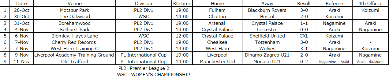 This is my first time to participate at the exchange program between PGMOL and JFA. During my match, I faced a strong physical play style and had to deal with the correct decisions. In addition, I needed to communicate more with the players. It was great to see that teams and referees were cooperating with each other to create more exciting matches. We had an opportunity to meet a Premier League referee before his match. In his match at a traditional stadium with full spectators, I was very impressed by the power of football, the wonderful atmosphere and the referee's power such as strong belief and management skill displayed. I will do my best and make use of these valuable experiences in my future refereeing activities.