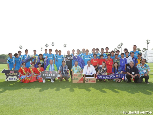 The team received enthusiastic welcomes by many fans at the Kagoshima airport before they arrived in Ibusuki. And they were also greeted by Ito Yuichiro, governor of Kagoshima Prefecture, and Toyodome Etsuo, mayor of the Ibusuki city, at the field before e their practice. While the Japan team was presented some local products, such as black berkshire and dried bonito shavings, they were also given folded-paper cranes by local elementary school students for praying the best wishes in the World Cup.