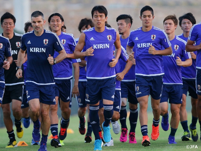 Except for midfielder HONDA Keisuke (AC Milan) and forward MINAMINO Takumi (Salzburg), who join the team one day late due to their respective club matter, 21 men began a running workout after listening to Coach Vahid HALILHODZIC's talk. The squad spent time recovering from fatigue with light workouts including fitness training and passing drills in two groups with goalkeepers.