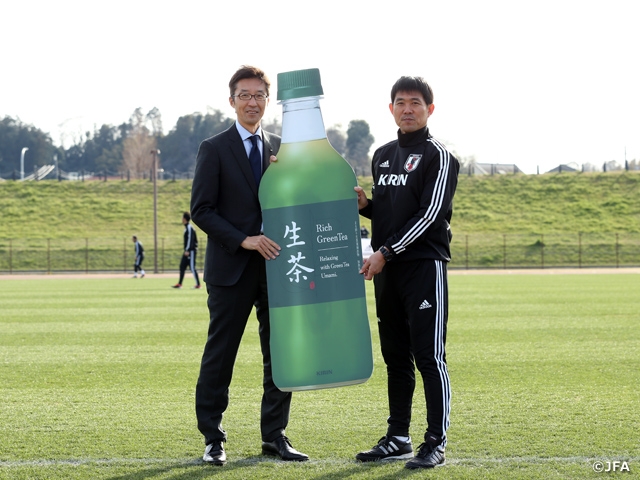Prior to the training session, the team’s official partner, Kirin Beverage Company, Limited of the Kirin Group offered their support, as the Metropolitan District, Yokohama Branch Regional Director SATO Eiji paid a visit to offer the team with “Nama-Cha” and “Kirin Lemon,” and Coach Moriyasu received the gift in behalf of the team.