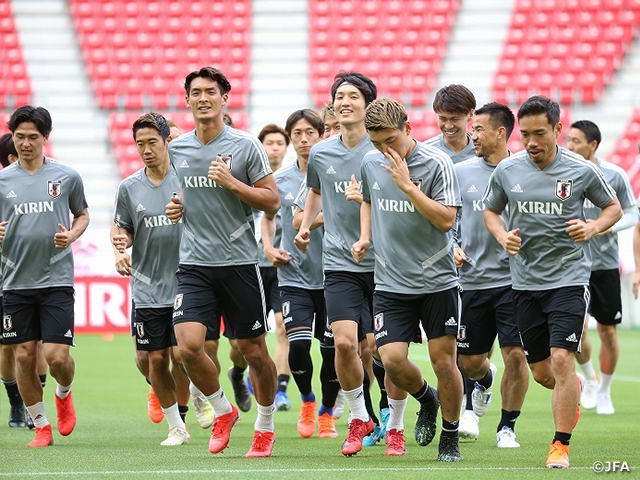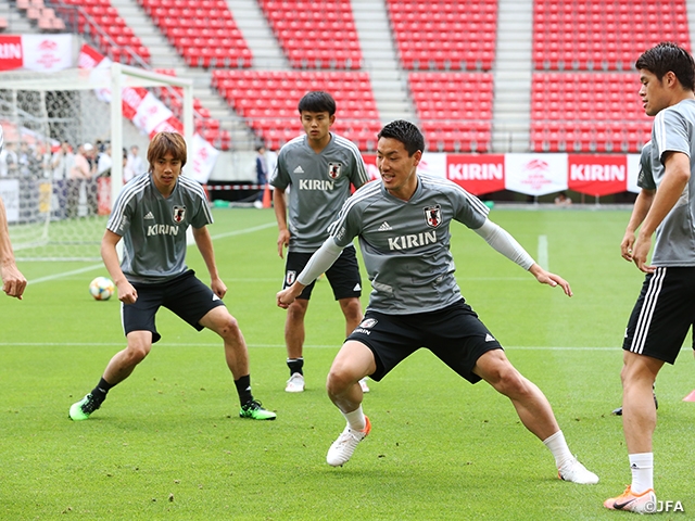 On Tuesday 4 June, with the KIRIN CHALLENGE CUP 2019 match against the Trinidad and Tobago National Team scheduled on the following day, the SAMURAI BLUE (Japan National Team) held their official training session at the match venue, Toyota Stadium in Aichi prefecture. Also, on this day, Coach MORIYASU Hajime appeared in the official press conference and stated that the team will “Enter the match with a challenger’s spirit.”