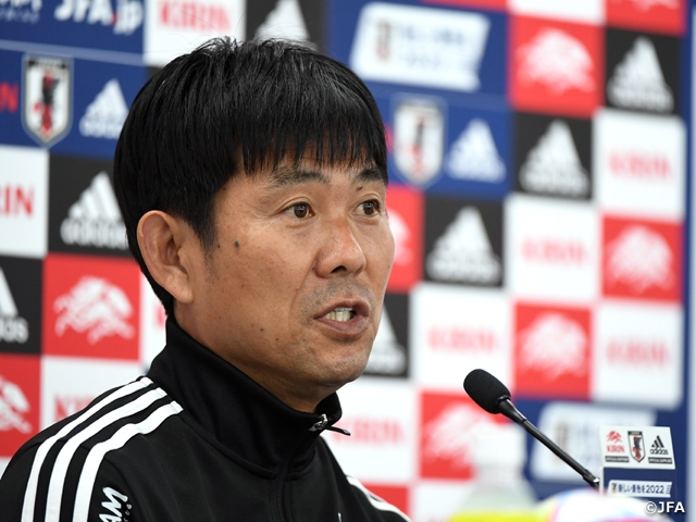 On Sunday 5 June, Head Coach MORIYASU Hajime of the SAMURAI BLUE (Japan National Team) appeared in the official press conference held at the Japan National Stadium, the match venue for the second fixture of the KIRIN CHALLENGE CUP 2022 between the SAMURAI BLUE and the Brazil National Team, and shared his aspiration to “show everything we've got and fight for victory.”