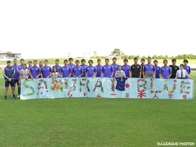 This day, four persons who represented the Japanese community school in Sydney, including their head of the student council, visited the practice and handed a supportive banner to the team. The banner had colorful letters of SAMURAI BLUE, which were actually painted with hand prints of the student at the school, and the team and the visitors took a photo together with the hand-made banner.