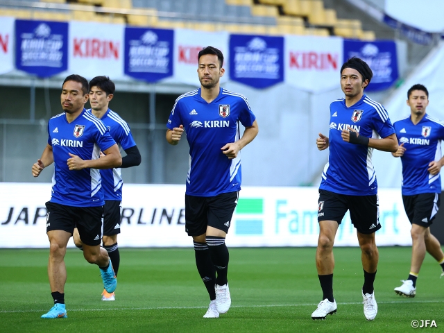 The SAMURAI BLUE (Japan National Team) held an official training session at Noevir Stadium Kobe (Hyogo) on Thursday 9 June, one day before their first match of KIRIN CUP SOCCER 2022 against the Ghana National Team. At the official press conference held on the same day, Head Coach MORIYASU Hajime expressed his aspirations for the match, saying: “We will be competing for the title. We will try to build the team while striving for victory.”