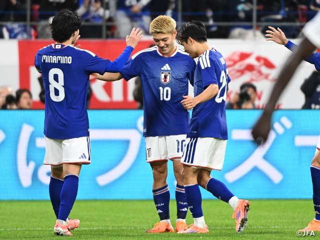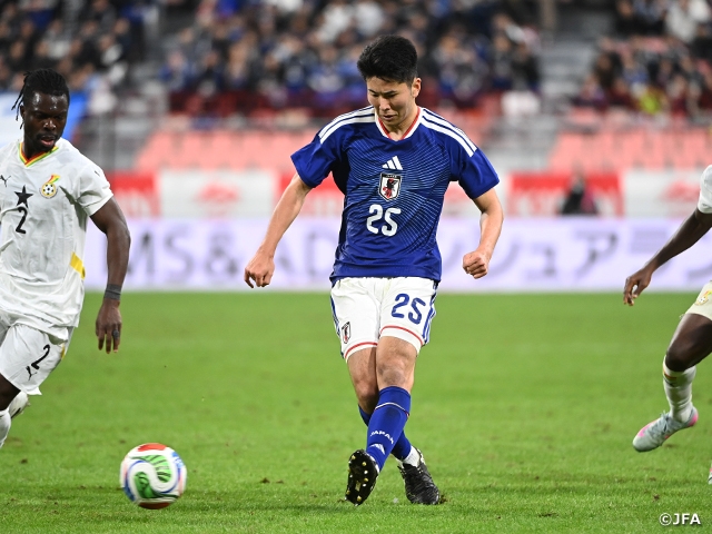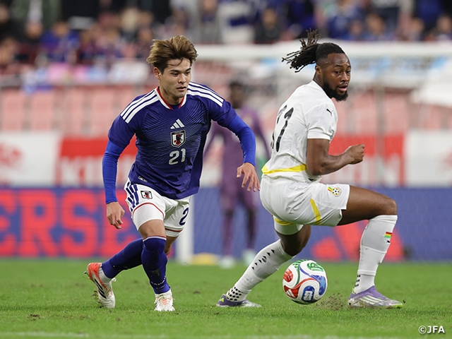 SAMURAI BLUE (Japan National Team) saw off the Ghana National Team—who have already secured their place at next year’s FIFA World Cup 26™—with a composed 2–0 victory in the KIRIN CHALLENGE CUP 2025 on Friday 14 November at Toyota Stadium in Aichi. MINAMINO Takumi (AS Monaco) broke the deadlock with his 26th international goal, moving into joint eighth on Japan’s all-time scoring list, before DOAN Ritsu (Eintracht Frankfurt) added a second to seal the win.