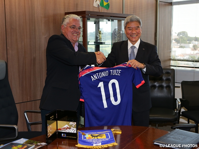 President Daini told Tuize his appreciation for the city for having accepted it as the camp site for Japan during the tournament. As Daini handed a JFA pennant and a Japanese jersey with No. 10 and the mayor's name on the back, Tuize was all smiles with the jersey in his hands with the applauses by the city officials from behind. In return, the mayor presented the JFA some memorial articles, including memorial stamps that were put in a frame.