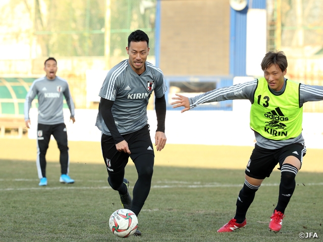 As the three goalkeepers went through their own drills, the field players were separated into two groups based on either they participated in the training session on the day before or not. While YOSHIDA Maya (Southampton FC) and SAKAI Hiroki (Olympique de Marseille) were among those who trained on the day before, the 10 players went through various possession drills to work on their passing and transitions. During these drills, coach MORIYASU Hajime gave out detailed directions to keep the players on the same page. Following the session, players were seen working on their own drills, as NAGAI Kensuke (F.C. Tokyo) and SUZUKI Musashi (Hokkaido Consadole Sapporo) were among those who went through drills to convert crosses.