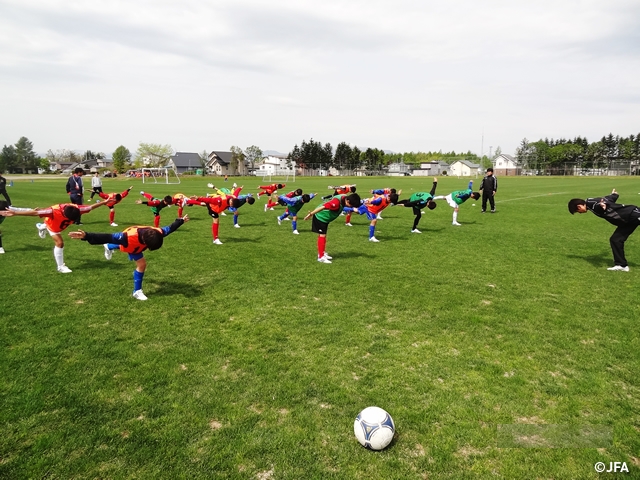The third day report for National Training Centre U-14 first half is from the Eastern Japan (Hokkaido, Tohoku). 36 players of National Training Centre in Eastern Japan are taking part in the camp at “Naka Satsunai Koryu-No-Mori”, located close to Tokachi-Obihiro Airport, Hokkaidao. As National Training Center program goes into latter half of the training, the players looked bit tired but they are highly motivated and aggressively working on the training. As they watched the video of the training at the night time meeting, they shared what’s achieved and what’s need to challenge, in preparation for the last day of the training.