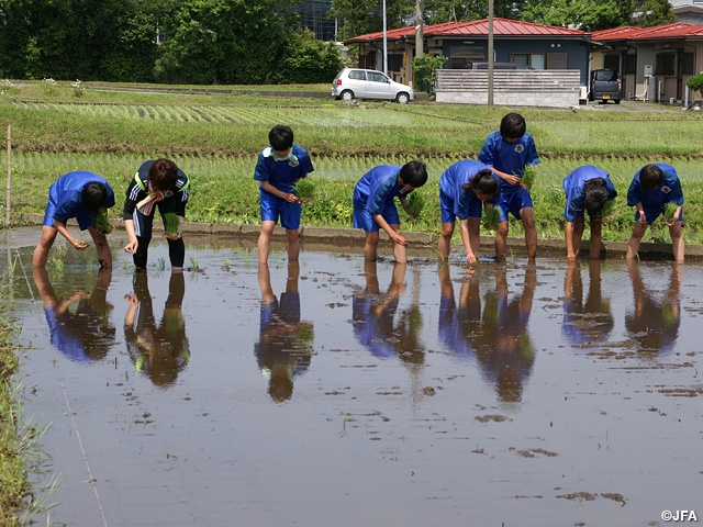 The female players set out rice seeds at JFA Academy Fukushima on 24 May (Saturday).
