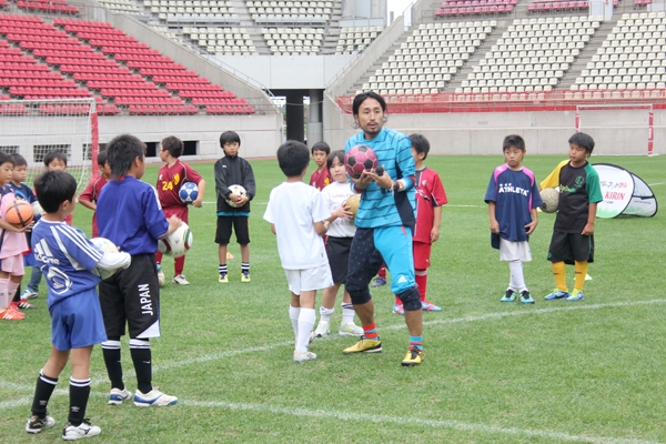 午前の試合終了後に「キリン フットサル教室」が開かれた。講師は元プロフットサル選手で芸能人フットサルチーム「ガッタス ブリリャンチスH.P.」の古庄亨コーチで、吉沢ひとみ、是永美記選手も加わった。幼稚園児から小学6年までの約100人が参加した。 この日のテーマはドリブルコントロール。一直線に並んだ仲間の間をスラロームしたり、2組に分かれてドリブルし中央でぶつからないように相手を抜く練習を繰り返した。古庄氏は「茨城県の子どもはレベルが高い。幼稚園児まで完璧にできていました」と感心していた。ミニゲームの4年対6年の試合では、4年生チームのGKとしてプレーした。6年生は速いパス回しなどで何とか壁を破ろうと、頭脳的なプレーを展開。「子どもたちは知恵を絞ったプレーをしていた。工夫することが上達の道」と満足そうだった。